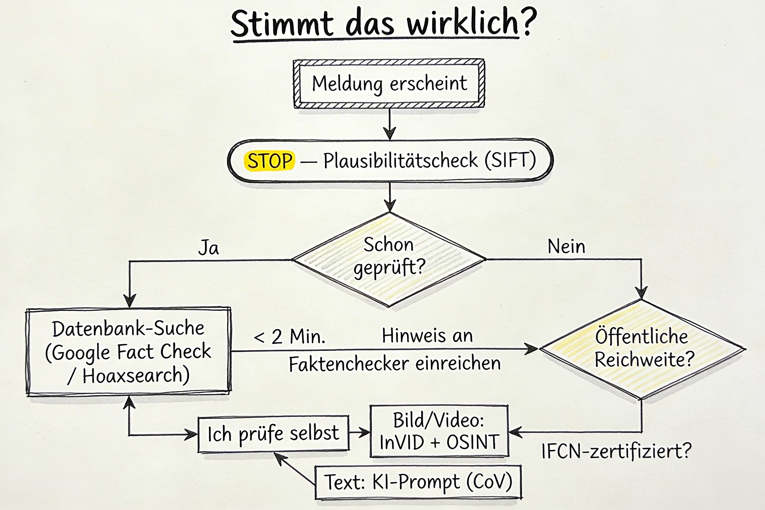 - Ich möchte selbst prüfen – ein Bild, ein Video, einen Text? → Eigene Verifikations- Tools und ein strukturierter KI-Prompt helfen weiter.